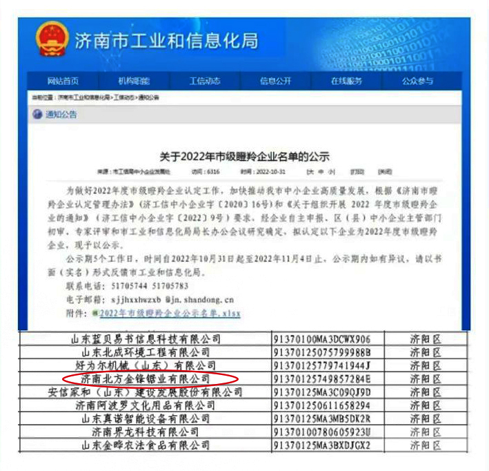 繼被認定國家級高效技術企業、山東省知名品牌企業、山東省“專精特新”企業、濟南市綠色工廠、“國家火炬計劃產業化示范項目”等榮譽稱號后,新近,金鋒鋸業又獲得濟南市“瞪羚”企業榮譽稱號,這是企業強本固基、提質增效、創新驅動、激發活力的有力佐證。