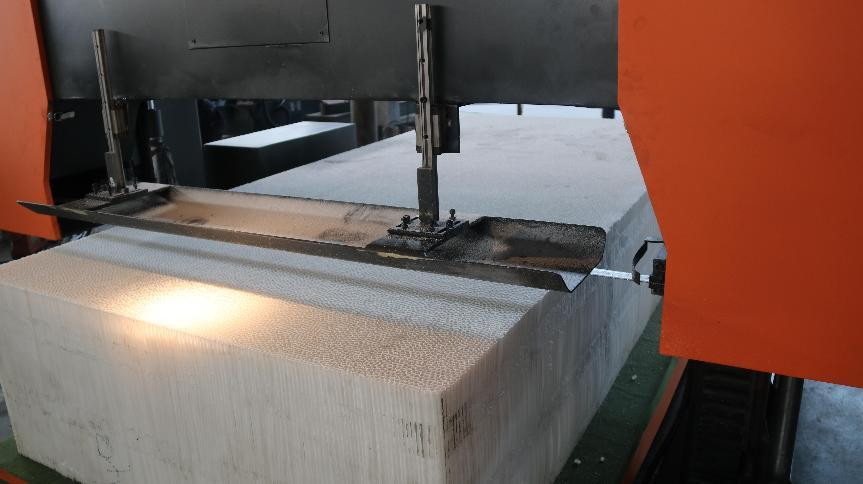 發(fā)泡鋁又稱泡沫鋁,是以氫化鈦為增粘劑和發(fā)泡劑,加入熔融的鋁中攪拌而制成的一種集結(jié)構(gòu)和性能一體化的新型功能材料。 泡沫鋁是超輕純金屬材料,主要在于打造鋸床合適的鋸切范圍、靈活的工作臺、合理的固定裝置以及為客戶設(shè)計正確的鋸床切割參數(shù),使帶鋸床達(dá)到穩(wěn)定的鋸切效果,保障不對材料切割表面造成損耗。客戶所需切割的發(fā)泡鋁面積大,而對承重要求不高,因此適合使用具有高承載面積的數(shù)控臥式結(jié)構(gòu)帶鋸床。